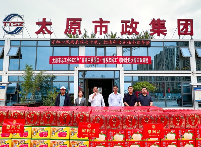 9月19日下午,太原市總工會黨組書記、副主席汪倫,太原市政府農(nóng)民工辦公室科長任俊峰一行來到集團公司興華街周邊排水系統(tǒng)及道路園林景觀提標改造工程二標段施工現(xiàn)場開展“喜迎中秋國慶·情系農(nóng)民工”慰問活動,送來月餅、豬肉、水果等慰問品。太原市市政公共設(shè)施建設(shè)管理中心興華街項目負責(zé)人牛瑞浩,集團公司黨委委員、紀委書記李茁,黨委委員、監(jiān)事會主席、工會主席馮忠參加了活動。