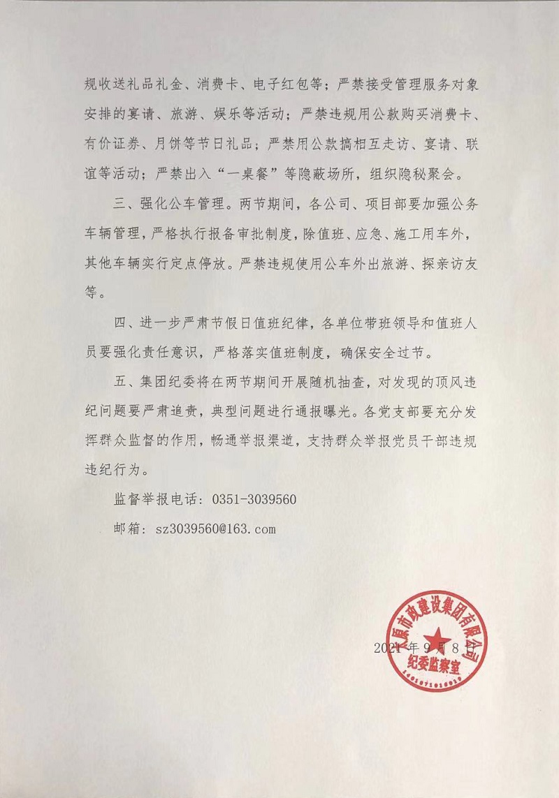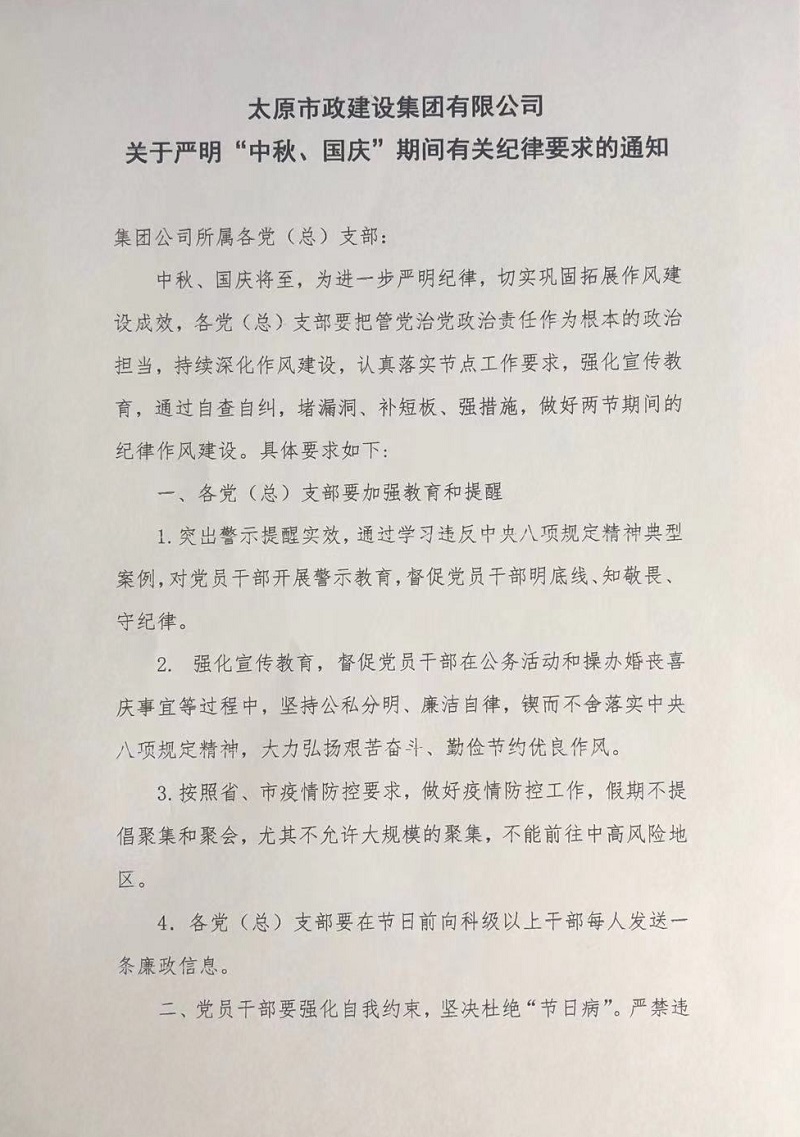 太原市政建設(shè)集團有限公司關(guān)于嚴(yán)明“中秋、國慶”期間有關(guān)紀(jì)律要求的通知