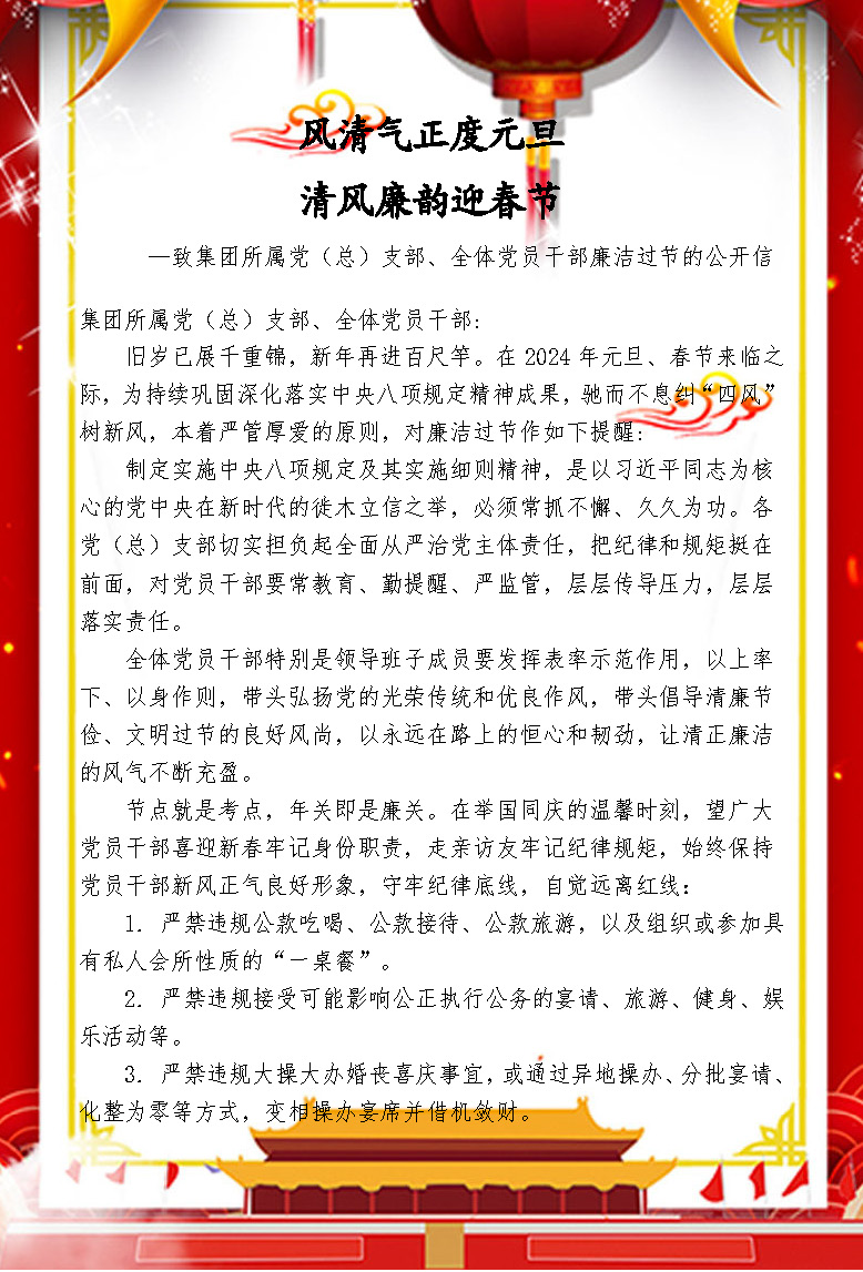 ——致集團(tuán)所屬黨(總)支部、全體黨員干部廉潔過節(jié)的公開信 發(fā)布時間:2023-12-28 10:20:41 來源:本站 閱讀:14779
