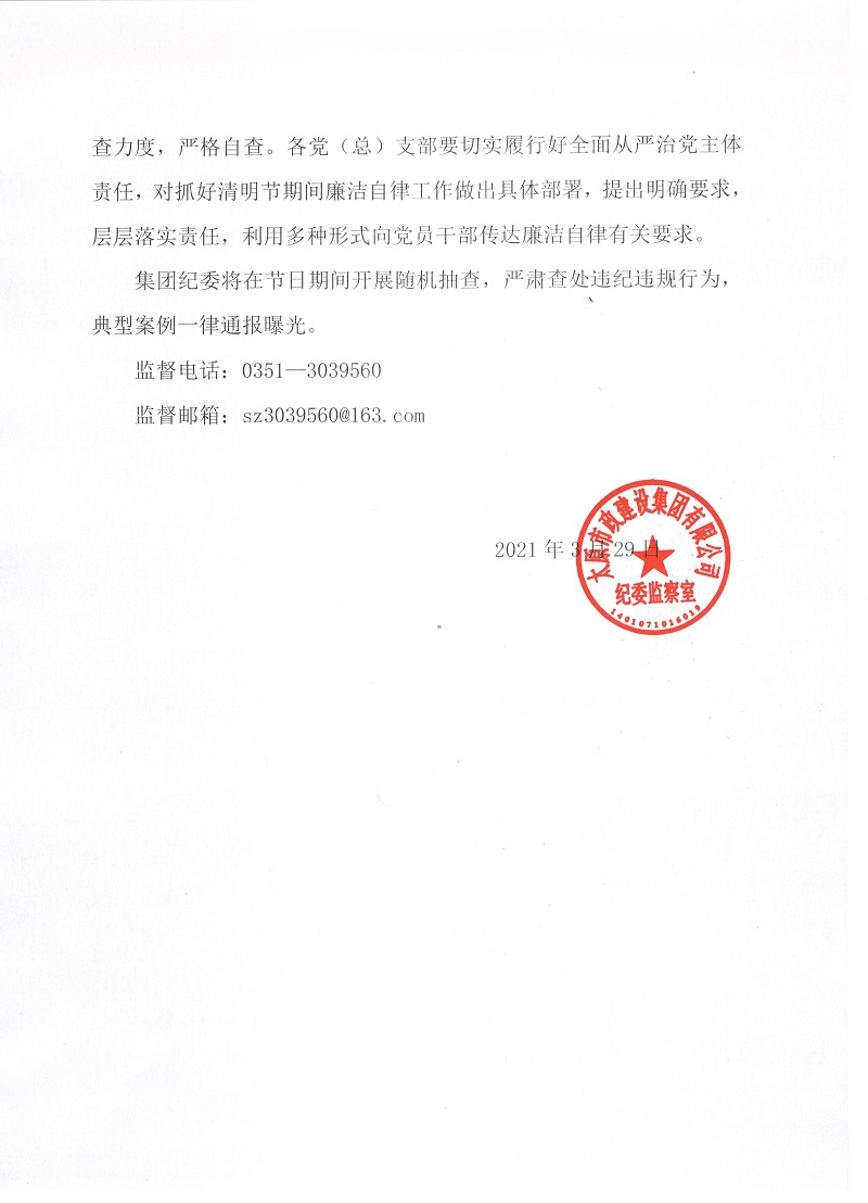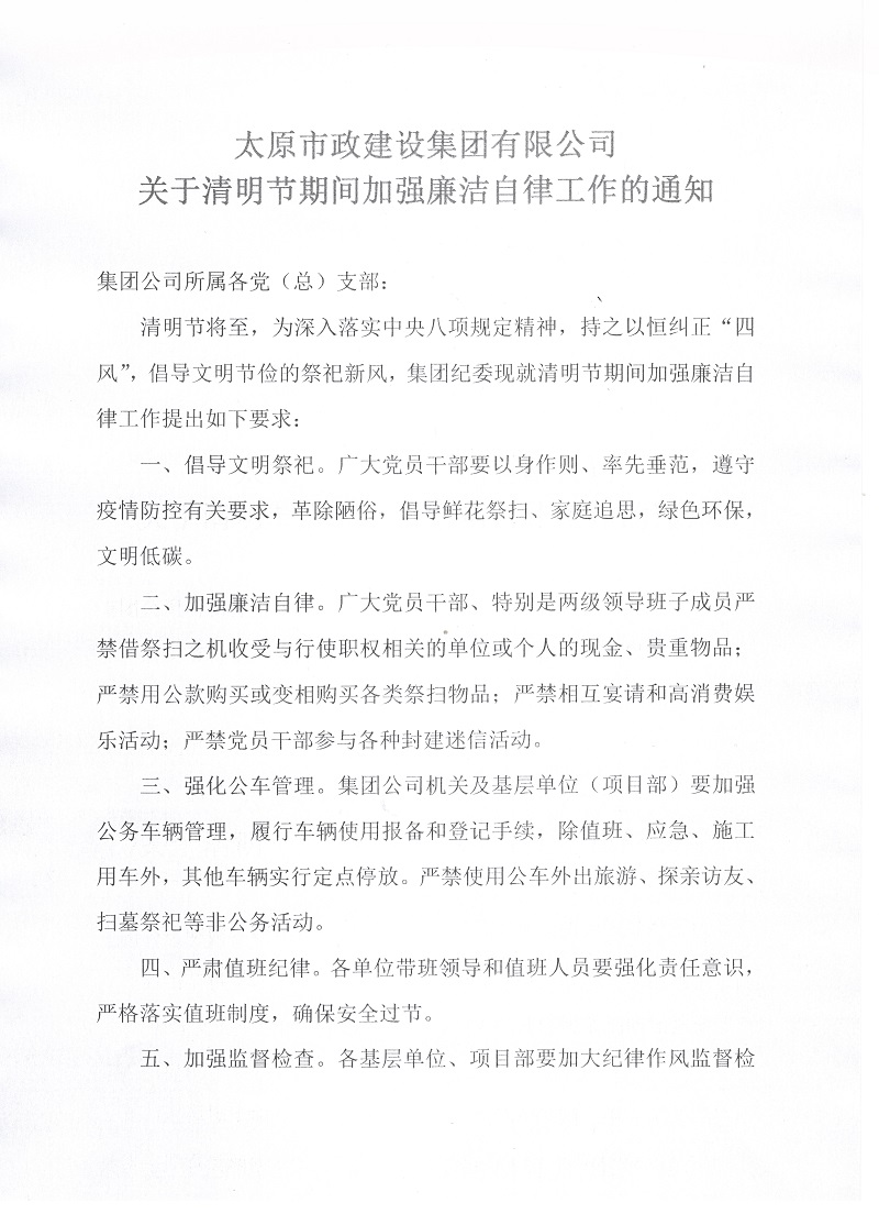太原市政建設(shè)集團有限公司關(guān)于清明節(jié)期間加強廉潔自律工作的通知