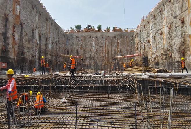 自工程開工以來,項目部合理規(guī)劃、統(tǒng)籌安排,先后完成了三軸水泥土攪拌樁、地下連續(xù)墻、抗拔樁、冠梁等一個又一個節(jié)點目標,高效推進工程建設。6月,為趕在汛期來臨前完成調(diào)蓄池和泵房底板混凝土澆筑的施工任務,項目部做足前期保障工作,針對基坑內(nèi)作業(yè)面狹窄,土方、鋼筋、模板、混凝土澆筑等工程量大的情況。項目部緊密圍繞節(jié)點目標,從人員配置、材料供應、安全措施、設備保障等方面進行全面規(guī)劃、統(tǒng)籌部署,保證各工序相互銜接、有序推進。同時,項目部采取對人、材、機進行動態(tài)調(diào)整的方法,24小時不間斷安排作業(yè),確保多個作業(yè)面同時施工,嚴格按日計算施工進度,全力推動工程進展。