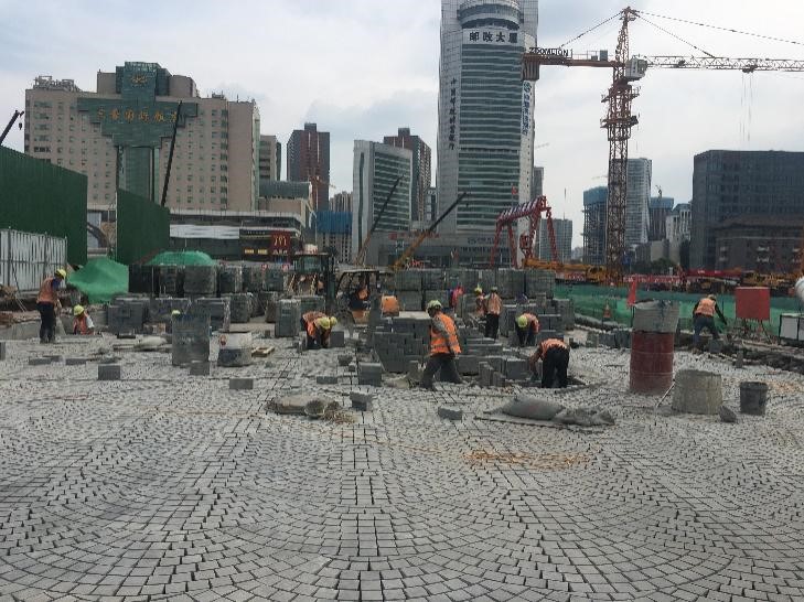 該工程包括七條道路及管網(wǎng)的施工建設(shè),其中涉及大量人工進(jìn)行花崗丁石的鋪裝任務(wù),項(xiàng)目部結(jié)合實(shí)際、統(tǒng)籌管理,將七條道路分為三個(gè)工區(qū),形成各條道路互不影響、全面鋪開(kāi)的施工局面,各工區(qū)針對(duì)鋪裝關(guān)鍵點(diǎn)進(jìn)行隨時(shí)監(jiān)測(cè),組織施工人員全天候盯守現(xiàn)場(chǎng),及時(shí)監(jiān)測(cè)石材鋪裝過(guò)程,嚴(yán)格把控鋪裝紋路、石材縫隙、打磨程度等,確保鋪裝質(zhì)量達(dá)到規(guī)定要求。目前,該工程已進(jìn)入全路面鋪裝階段,平均每天有260多名民建隊(duì)人員參與石材鋪筑,項(xiàng)目部將整個(gè)隊(duì)伍按照花崗巖“切割、鋪裝、灌縫、打磨”的施工環(huán)節(jié)進(jìn)行分組,各組全面負(fù)責(zé)一道工序,極大提升工作積極性,形成相互促進(jìn)、互相學(xué)習(xí)的良好氛圍,并采用分段鋪裝打磨的方式,有效提高施工效率,保證施工進(jìn)展。