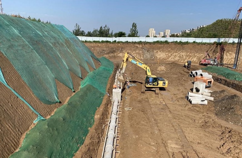 該工程雨污水管道、電力隧道的部分管線為深溝槽作業(yè),溝槽平均深度為4米,最深處達6米。同時,該工程部分路段涉及挖方量大的情況,這些都增加了施工難度和危險系數。項目部技術人員根據施工現場實際情況,共同研究應對措施,制定了《深溝槽開挖專項方案》和《大挖方邊坡修整、支護方案》,采取了分級放坡開挖和邊支護邊開挖的方式,有效防止兩側土體的塌落;在挖方路塹施工時,及時掛網噴漿,有效維護了邊坡穩(wěn)定;在開挖坡頂設置了截水溝,有效防止雨水的溝槽和邊坡的沖刷和浸泡,增加了施工的安全系數,切實保證了在溝槽和路塹開挖段內作業(yè)機械和人員的安全。