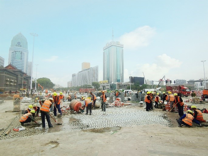 廣場南路段是目前施工最為忙碌的一個路段,花崗巖丁石砌筑、路面清理、廣場綠化、路側(cè)石安裝多道工序同時進(jìn)行。道路一側(cè)工人們正在進(jìn)行花崗巖丁石切割、鋪裝、灌縫、打磨,另一側(cè)路側(cè)石的安裝、砌筑也在同步作業(yè);園林綠化還在進(jìn)行廣場的裝飾;叉車來回穿梭著運(yùn)送石料、水泥,霧炮車在工地上不停降塵,灑水車正在對路面進(jìn)行清洗,打磨機(jī)正在對花崗巖丁石進(jìn)行打磨,全體施工人員上下一心,24小時奮戰(zhàn)在施工一線,以“鐵軍”的堅定意志,確保工程按期完工。