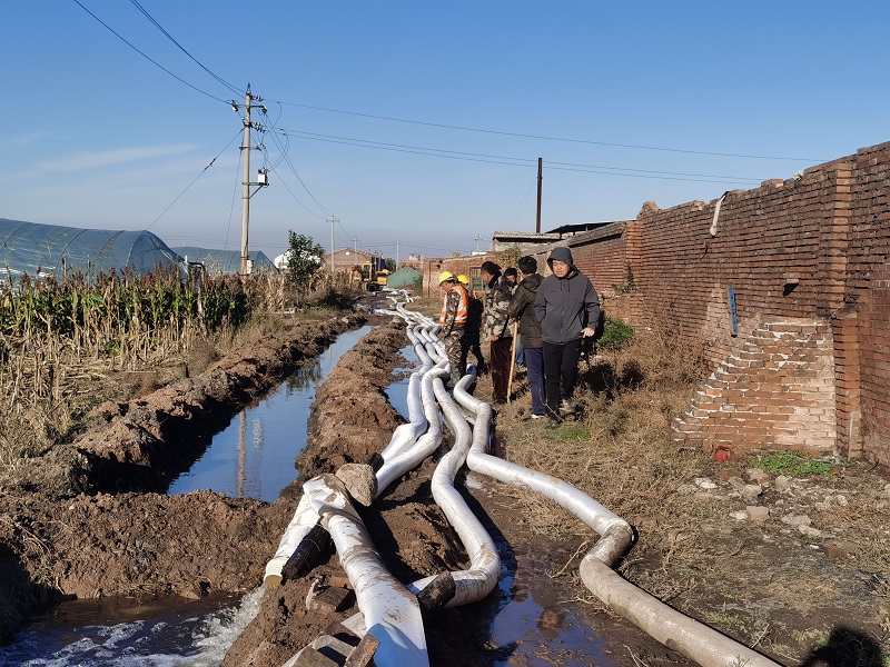 由于該村緊鄰象峪河,因河道水位持續(xù)高漲,村內(nèi)積水無(wú)法自然排出,導(dǎo)致近98萬(wàn)平方米耕地被淹,總積水量約為60萬(wàn)立方米。搶險(xiǎn)突擊隊(duì)以里旺村小區(qū)西側(cè)耕地最低點(diǎn)為起點(diǎn),呈樹(shù)枝狀布置水泵,以村莊東處的象峪河為排水末端,通過(guò)最低點(diǎn)水泵提升、中端水泵轉(zhuǎn)輸、末端水泵強(qiáng)排的三級(jí)聯(lián)排,并利用地形高差、開(kāi)溝槽下管引流等方式降低耕地整體水位。經(jīng)過(guò)六天的晝夜奮戰(zhàn),截止10月18日晚,抽排積水約17萬(wàn)立方米,積水面消退約15萬(wàn)平方米,疏導(dǎo)退水渠約1400米。