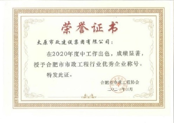 3月,集團(tuán)公司榮獲合肥市市政工程協(xié)會頒發(fā)的2020年度“合肥市市政工程行業(yè)優(yōu)秀企業(yè)”榮譽(yù)稱號。張晉虎、王東根榮獲2020年度“合肥市市政工程行業(yè)優(yōu)秀項目經(jīng)理”榮譽(yù)稱號。