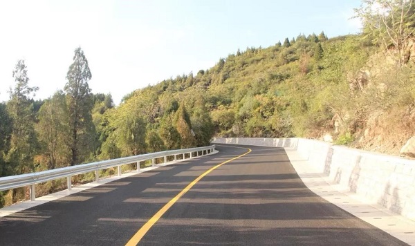 由于施工路段全部為山路,材料的運(yùn)輸、攤鋪困難。在水穩(wěn)攤鋪時,材料和機(jī)械無法一次性到位,需要二次上料,二次倒料,運(yùn)輸車先將瀝青混合料倒在指定地點(diǎn),再用小型鏟車將混合料裝到攤鋪機(jī)上。攤鋪過程中,山路坡度較大,靜態(tài)壓路機(jī)無法進(jìn)行作業(yè),只能先采用振動壓路機(jī)碾壓,再用雙鋼輪壓路機(jī)進(jìn)行二次碾壓,保證水穩(wěn)面層壓實(shí)度符合規(guī)范要求。針對坡陡、彎急的山路特點(diǎn),項目部在施工建設(shè)中不僅對轉(zhuǎn)彎處路面進(jìn)行了加寬,還對路面外側(cè)進(jìn)行加高,使路面向山體一側(cè)傾斜,提高了行車安全和舒適度。此外,由于西山山體土質(zhì)疏松,項目部還在道路臨溝地段,建設(shè)下嵌式路肩擋土墻,擋土墻下嵌在地下60厘米到70厘米,有效防止路基邊坡平移、側(cè)滑。