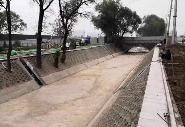 在施工中,由于市內(nèi)的壓頂磚供應(yīng)緊張,從市外運(yùn)送又費(fèi)時(shí)費(fèi)力,給施工進(jìn)度造成了一定的影響,為加快施工進(jìn)度,項(xiàng)目部決定先進(jìn)行靠背、墊層等環(huán)節(jié)的施工,最后再進(jìn)行卡邊石的鑲嵌工序,這樣不僅合理安排了施工工序,還大大加快了施工進(jìn)度。同時(shí),在作業(yè)面狹小的施工段,項(xiàng)目部不等不靠,安排80多名民建隊(duì)員同時(shí)進(jìn)行施工作業(yè),采取“人拉肩扛”的作業(yè)方式,全力推進(jìn)施工進(jìn)度。僅用時(shí)不到100天,項(xiàng)目部就完成了1800米的河道的清淤、底板澆筑、邊坡修整等工作任務(wù),主體工程全部完工,整個(gè)渠道“煥然一新”。