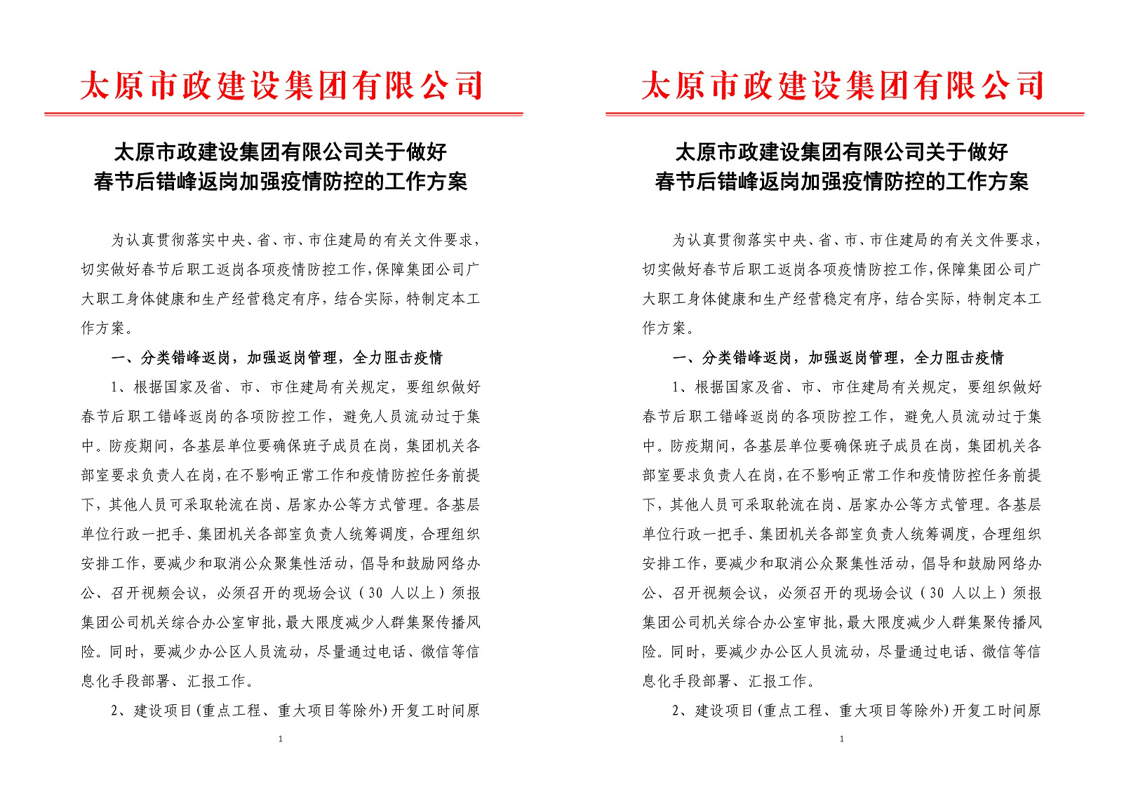 統(tǒng)一指揮,確保領(lǐng)導組織到位。為有效應對新冠肺炎疫情,集團公司迅速制定《太原市政建設集團有限公司新型冠狀病毒防控應急預案》,成立集團公司新型冠狀病毒感染的肺炎疫情防控工作領(lǐng)導小組,以強有力的領(lǐng)導統(tǒng)籌協(xié)調(diào)推進集團公司疫情防范和處置工作。同時,集團公司制定《太原市政建設集團有限公司關(guān)于做好春節(jié)后錯峰返崗加強疫情防控的工作方案》,對職工復工前以及返程中個人防護、網(wǎng)上辦公等事項作出詳細安排和明確要求,保障集團公司廣大職工身體健康和生產(chǎn)經(jīng)營穩(wěn)定有序。