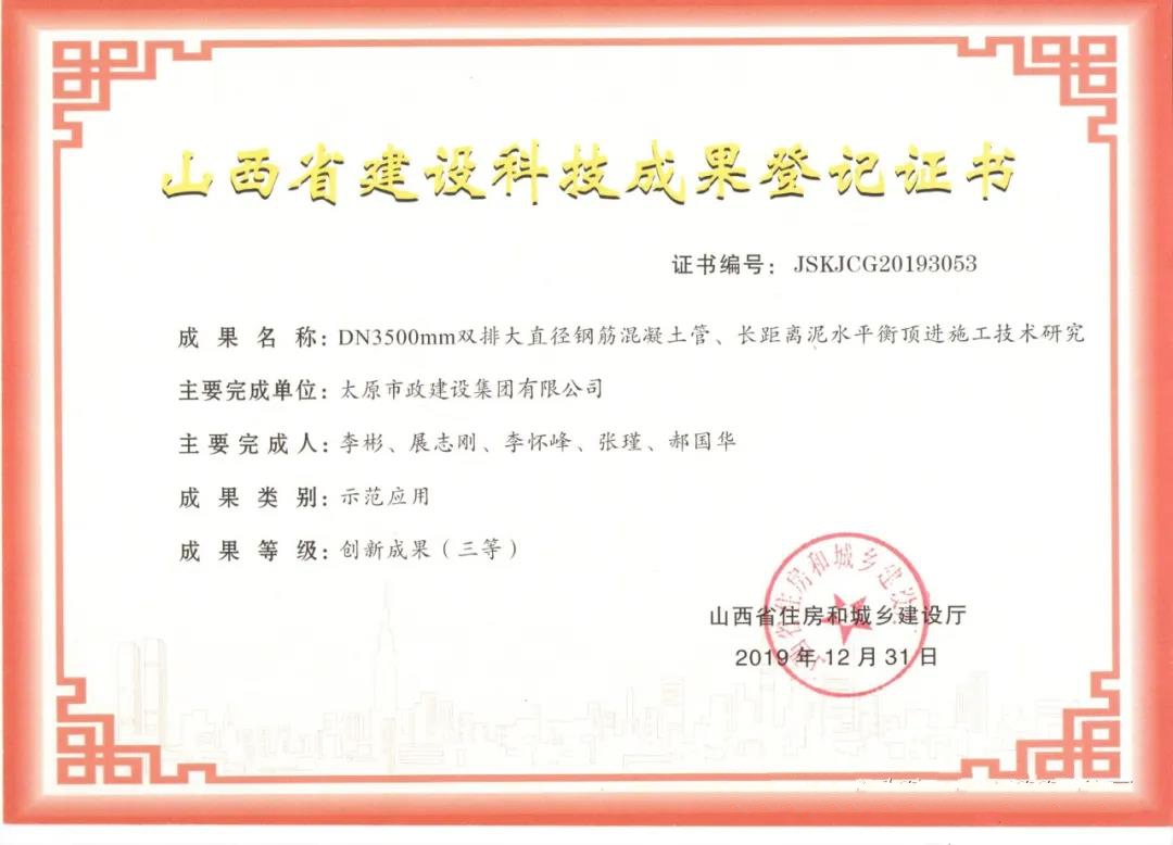 近日,集團公司申報的《DND3500mm雙排大直徑鋼筋混凝土管、長距離泥水平衡頂進施工技術(shù)研究》被山西省住房和城鄉(xiāng)建設(shè)廳評為創(chuàng)新成果(三等)。