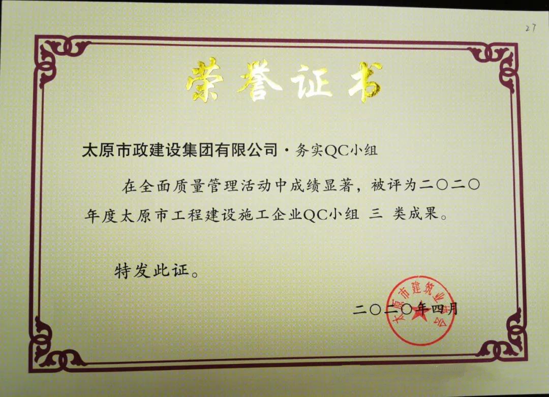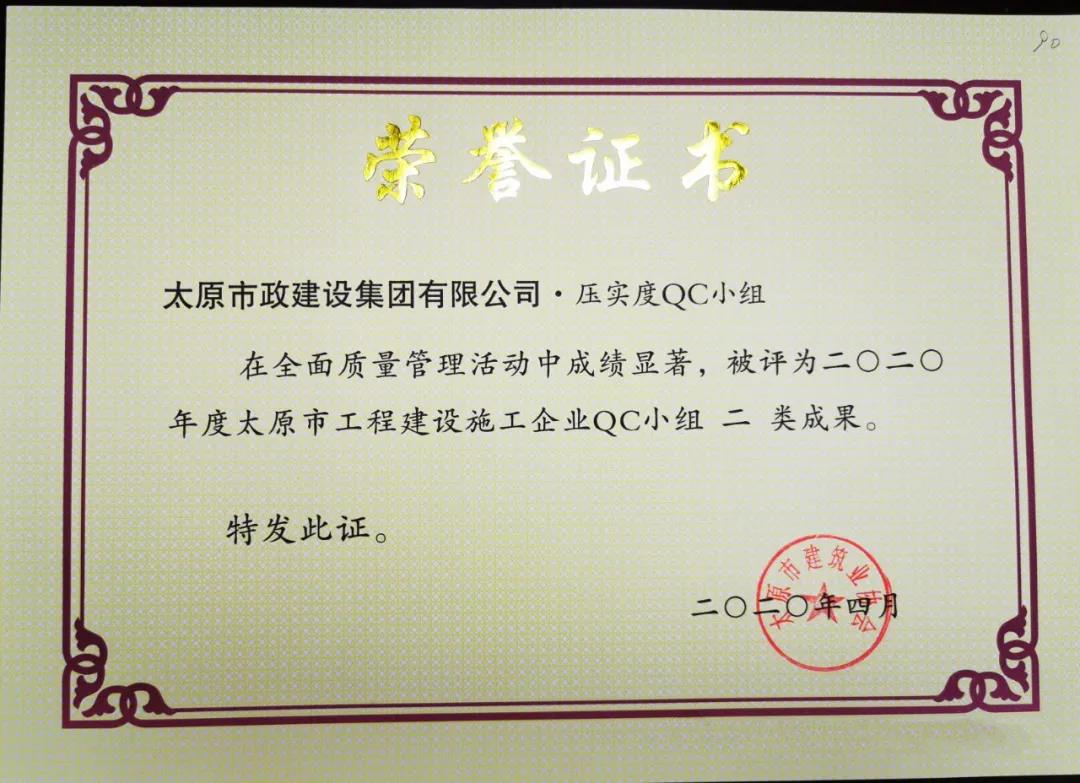 4月10日,集團公司壓實度QC小組的《濕陷性粉土壓實度控制》,被太原市建筑施工協(xié)會評為2020年度太原市工程建設(shè)施工企業(yè) QC小組二類成果;集團公司務(wù)實QC小組的《提高檢查井旁人行道磚的觀感質(zhì)量》,被太原市建筑施工協(xié)會評為2020年度太原市工程建設(shè)施工企業(yè) QC小組三類成果。
