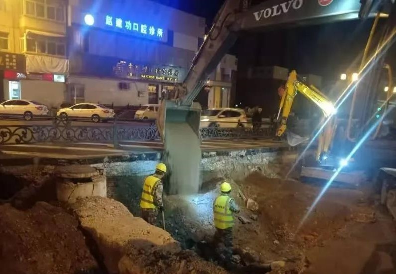 6日晚11點,經(jīng)過60余名搶修人員的共同努力,塌陷路面基本破除,供水管道搶修順利完成,恢復(fù)居民日常生活供水。